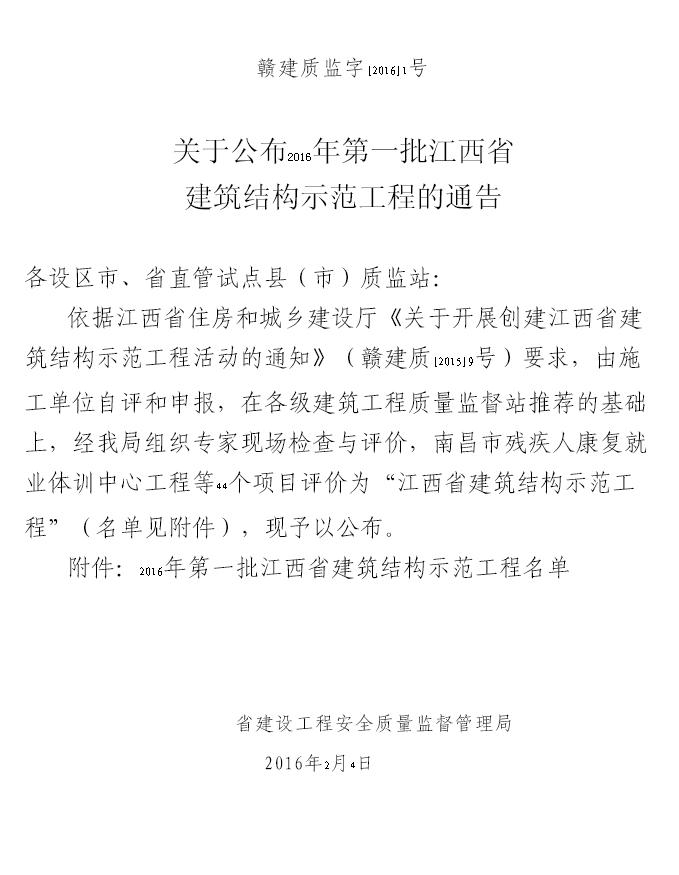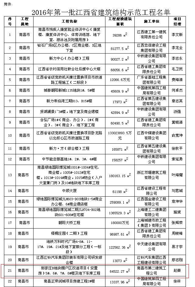 由南昌市第二建筑工程公司承建的郭家莊B地塊棚戶區(qū)改造項(xiàng)目(安置房)5#、6#、7#、8#樓及地下車庫工程獲“2016年第一批江西省建筑結(jié)構(gòu)示范工程” [摘自贛建質(zhì)監(jiān)字[2016]1號(hào)]。
