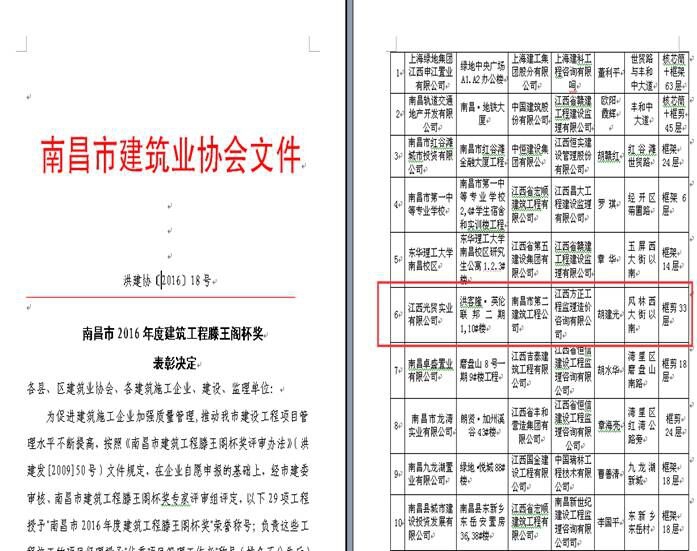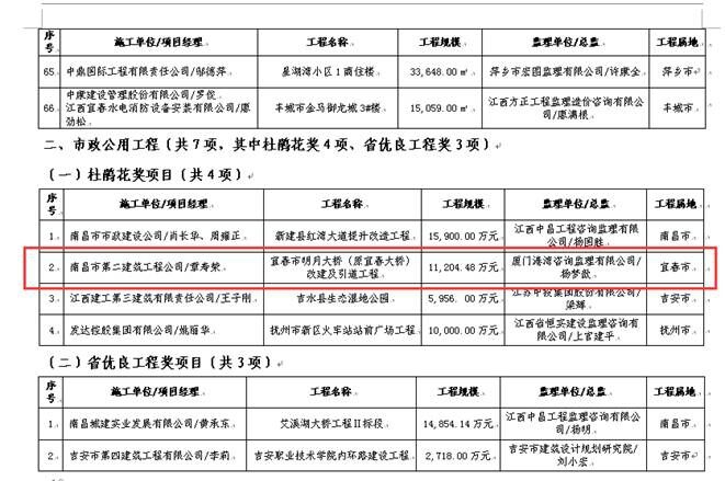 由南昌市第二建筑工程公司承建的江西旺旺新建廠房1#車間工程獲“2015年度江西省優(yōu)良工程獎(jiǎng)”,宜春市明月大橋(原宜春大橋)改建及引道工程榮獲“2015年度江西省杜鵑花獎(jiǎng)”[摘自江西省住房和城鄉(xiāng)建設(shè)廳文件贛建質(zhì)字[2016]5號(hào)]。
