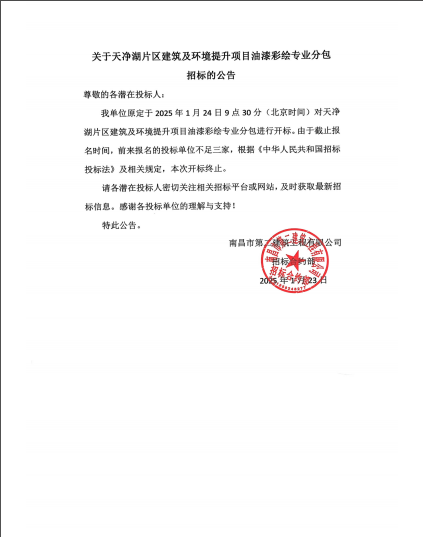 關(guān)于天凈湖片區(qū)建筑及環(huán)境提升項目油漆彩繪專業(yè)分包招標(biāo)的公告
